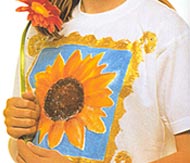 On the Sunny Sunflower T-shirt you can show off your artistic flair for color, shape and texture. In fact, your painting will be beautiful when framed in gold. So go ahead, wear your own creation.