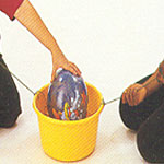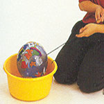Thread a 16in length of string through each hole, and knot the string around the rim. Half fill the plastic bowl with water and float the ball in the water.