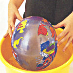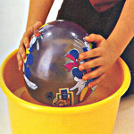 Place both hands on top of the ball, and push it down into the water gently but firmly. Look what happens to the level of water. It rises in a "high tide".