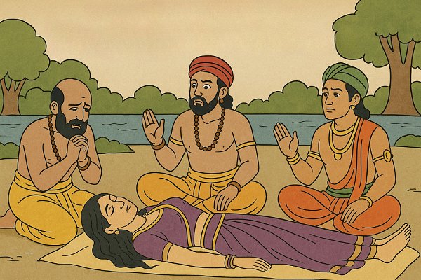 He said, 'I have learned the science of restoring the dead to life.' As soon as they heard this, they said, 'If you have learned this, restore our beloved to life.' He replied, 'Make a heap of the ashes and bones, and I will restore it to life.' They gathered together the ashes and bones. Then he took a charm out of the book, and muttered prayers; the girl rose up alive. Thereupon Cupid so blinded the three of them that they began wrangling among themselves."