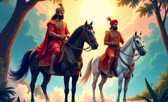 "It happened one day that the king mounted his horse for the chase, and Chiramdeva also joined his cavalcade. The king became accidentally separated from his followers in a forest, and the attendants lost themselves in another jungle; one, however, Chiramdeva, was following the king. At length, he called out, and said, 'Your majesty! all the attendants have remained behind, while I am accompanying you, making my horse keep pace with yours.' On hearing this, the king reined in his horse, and so he came up (to the king). The king looked at him, and asked, 'How hast thou become so emaciated?'"