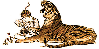 Then the prince took a little knife from his pocket, and cut the thorn out of the tiger's foot; but when he cut, the tiger roared louder than ever—so loud that his wife heard him in the next jungle, and came bounding along to see what was the matter. The tiger saw her coming, and hid the prince in the jungle, so that she should not see him.