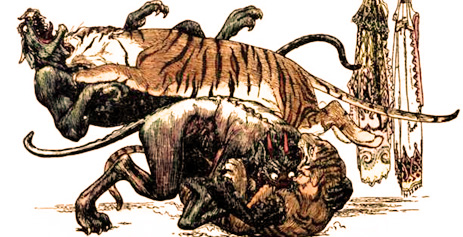 When he heard of the demons the Raja's son was very sad. "What can I do?" he said to himself. "How can I fight with these two demons?" Then he thought of his tiger: and the tiger and his wife came to him and said, "Why are you so sad?" The Raja's son answered, "The king has ordered me to fight with his two demons and kill them. How can I do this?" "Do not be frightened," said the tiger. "Be happy. I and my wife will fight with them for you."