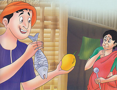 feet to catch the fish. Stuffing both in his bag, he ran home.