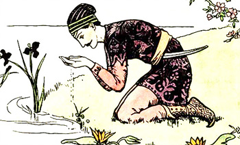 He saw a pretty, clear little brook running along not far from their resting-place, and hearing that its source was not far distant, he started off to find it. The source was a beautiful lake, which at that time was covered with the magnificent lotus flower and other water plants. The prince sat down on the bank, and being thirsty took up some of the water in his hand. Fortunately he looked into his hand before drinking, and there, to his great astonishment, he saw reflected whole and clear the image of a beautiful fairy. He looked round, hoping to see the reality; but seeing no person, he drank the water, and put out his hand to take some more. Again he saw the reflection in the water which was in his palm. He looked around as before, and this time discovered a fairy sitting by the bank on the opposite side of the lake. On seeing her he fell so madly in love with her that he dropped down in a swoon.