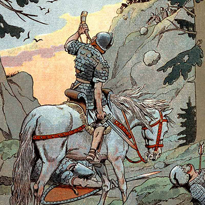 Thus did Roland again charge the enemy, his good sword Durendal in his hand; as the stag flies before the hounds, so did the heathen fly before Roland. "By my faith," cried the Archbishop when he saw him, "that is a right good knight! Such courage, and such a steed, and such arms I love well to see. If a man be not brave and a stout fighter, he had better by far be a monk in some cloister where he may pray all day long for our sins."