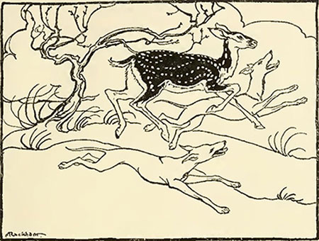 But he was again astonished, for the dogs did not kill. They leaped and played about the fawn, licking its face, and rubbing delighted noses against its neck.