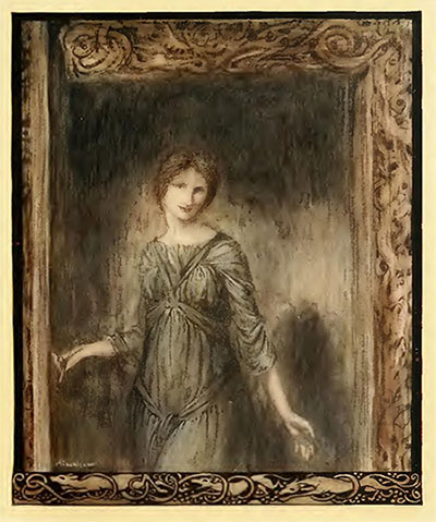 "He is known to you," she murmured. "I lived thus in the peace of Faery, hearing often of my mortal champion, for the rumour of his great deeds had gone through the Shi', until a day came when the Black Magician of the Men of God put his eye on me, and, after that day, in whatever direction I looked I saw his eye."