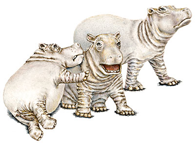 Three hippopotamuses were snuggled close together. And they were frightened. A lion sitting close by was, too. Everything was shaking all around them.