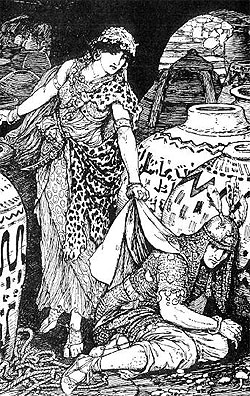 And where was he? No further than in a cool, dark cellar of the palace, crouching among huge earthenware pots of grain. With a rush of pain at her heart, there his wife found him, and she tried with all her strength to kindle in him a sense of shame, but in vain. Even the thought of the future danger he might run from the contempt of his subjects was as nothing when compared with the risks of the present.
