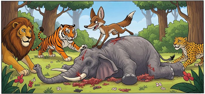 In the meantime, a lion came there. The jackal, ever quick-witted, said to him, "Your Majesty, please have a taste of the elephant. I have been guarding it for you only." The lion, with a roar of disdain, replied, "I eat only fresh animals, not the stale ones." With that, the majestic beast went on his way, leaving the jackal overjoyed. He still had the full dead body of the elephant intact in his possession.